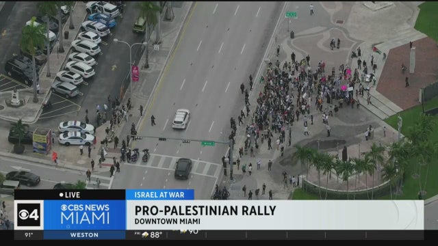 CBS News Miami's Larry Seward speaks to protesters at a pro-Palestinian rally in Downtown Miami in wake of the Hamas attacks on Israel.