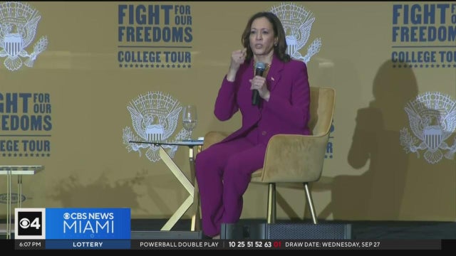Vice President Kamala Harris brought her "Fight for our Freedoms" college tour to Florida International University on Thursday, invoking a plea for democracy.