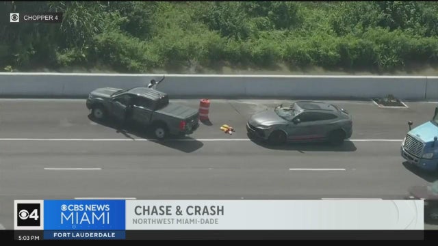 The driver of a Lamborghini led police on a pursuit near Doral on Monday. According to Miami-Dade police, the person in the SUV is reportedly wanted for battery on a law enforcement officer.