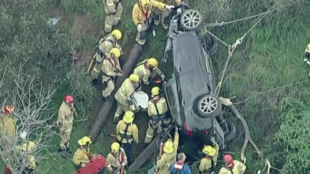 Terrifying moments in Los Angeles when firefighters rushed to rescue a woman whose car plunged down a 150-foot embankment.
