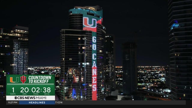 The tower lit up Saturday night for Monday's matchup between the Miami Hurricanes and Indiana Hooisers.