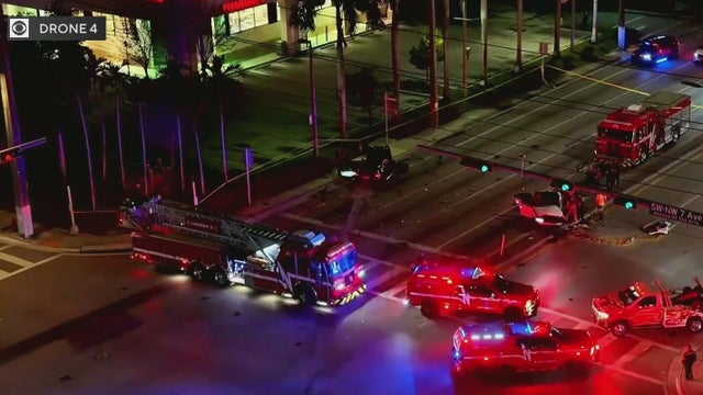 Three people were rushed to a hospital after a major crash that shut down Broward Boulevard in Fort Lauderdale early Wednesday morning, and officials say a firetruck was also hit while responding to the scene.