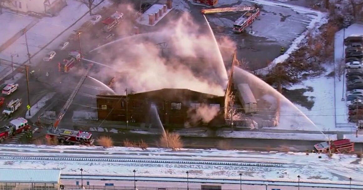 Firefighters fought the stubborn flames for hours, attacking the fire from the ground and from above. They even cut through a fence to get a ladder truck closer to the fire.