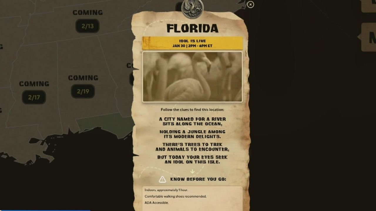 The first idol clue in the nationwide Survivor scavenger hunt has been released. The riddle points to a city named for a river with an indoor, jungle‑themed attraction where participants will search for the idol during an hour‑long adventure. The hunt officially begins Friday, and whoever finds the idol will be entered for a chance to win two tickets to the live Survivor 50 finale in Los Angeles. Viewers can find more details on CBSMiami.com..