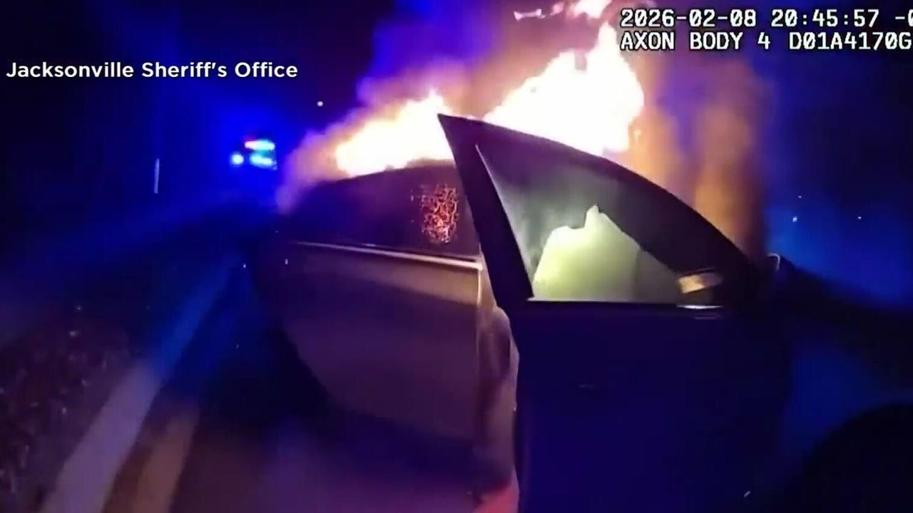 A dramatic video shows the moment when a police officer in Jacksonville was able to save a woman from a car that burst into flames.