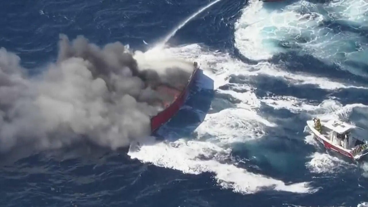 CBS News Chopper 4 captured the moment crews put out the blaze as the boat sank. Investigators are working to determine the cause of the fire.