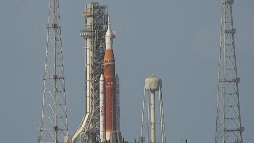People line up along Cocoa Beach to get a look at the Artemis II
