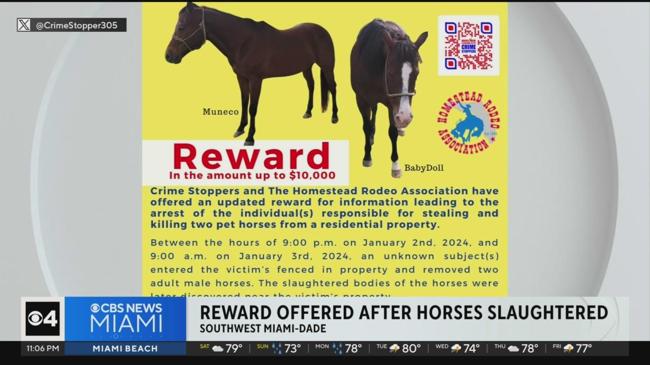Investigators are offering a $10,000 reward to find the person responsible for slaughtering two horses in Southwest Miami-Dade.