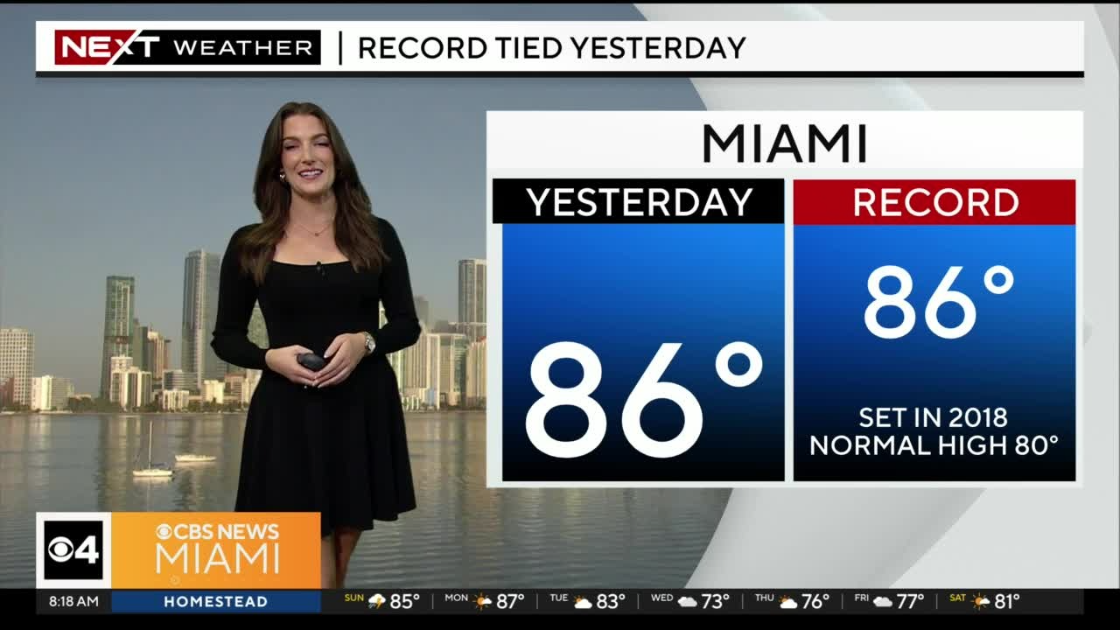 CBS News Miami's NEXT Weather Meteorologist KC Sherman says as Miami tied with its record heat on Saturday, Sunday will continue the warming trend before a cold front brings down temperatures by mid-week.
