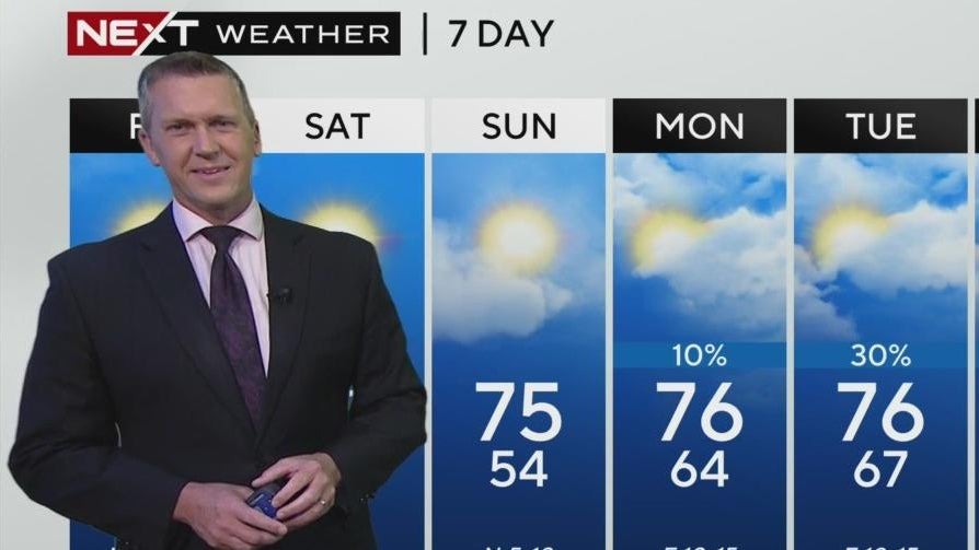 NEXT Weather meteorologist Dave Warren says afternoon highs will top out near 80 degrees. Cool air from the north moves in Friday night into Saturday morning. Lows will be in the 50s this weekend.