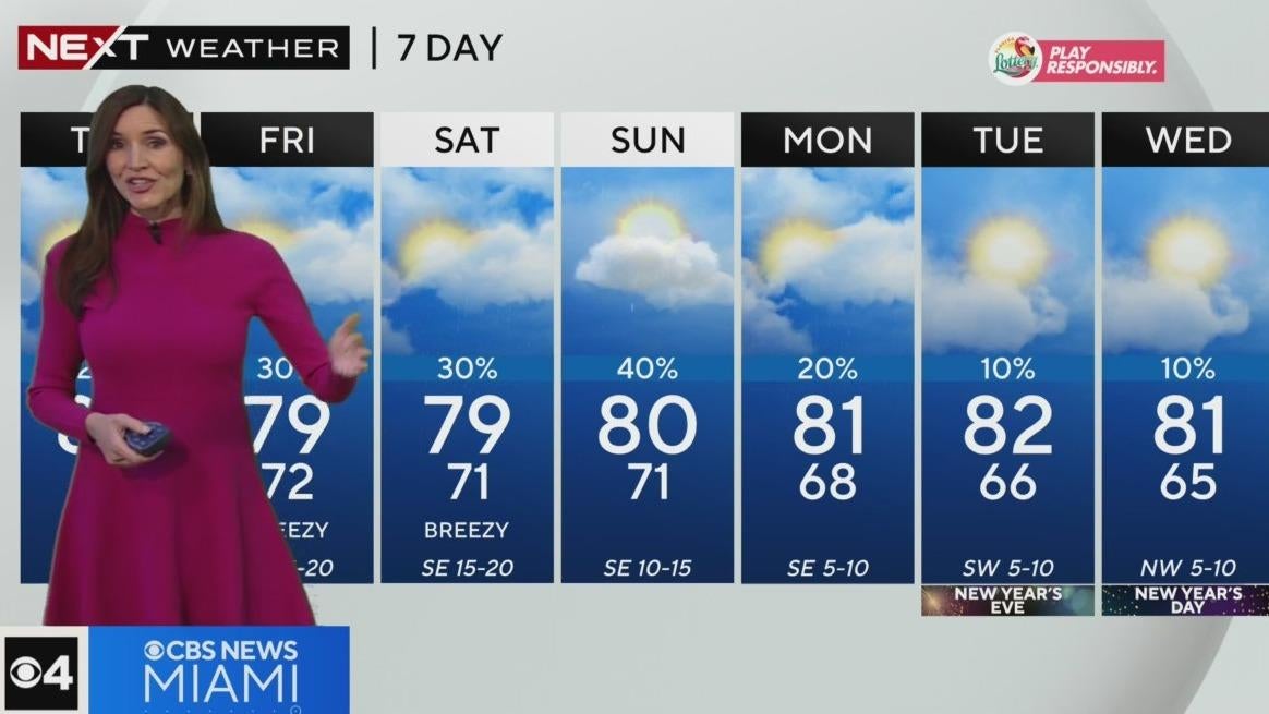 CBS News Miami meteorologist Lissette Gonzalez says the warm weather will continue as the high will be around 80 degrees with plenty of clouds through the day and only a 20% chance of sprinkles.