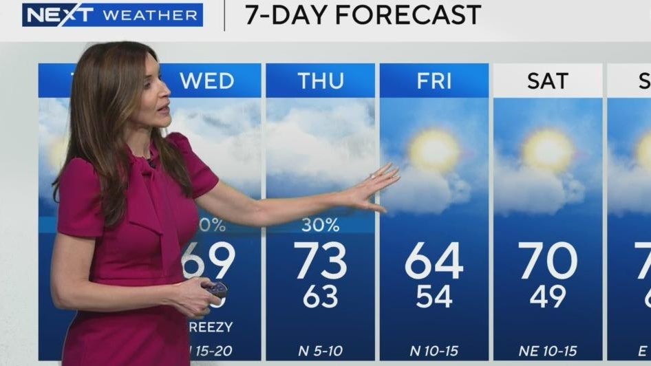 NEXT Weather meteorologist Lissette Gonzalez says Tuesday afternoon will remain mostly cloudy with highs in the low 70s. The chance of rain increases on Wednesday.