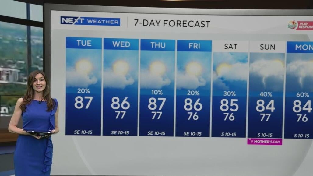 NEXT Weather meteorologist Lissette Gonzalez says Tuesday afternoon will remain partly cloudy with highs in the upper 80s. It will feel like the 90s when you factor in the humidity.