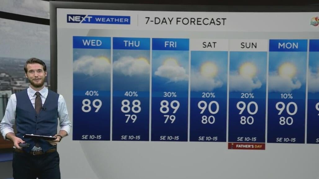 NEXT Weather meteorologist Shane Hinton says a few scattered showers are possible in the afternoon with highs in the upper 80s.