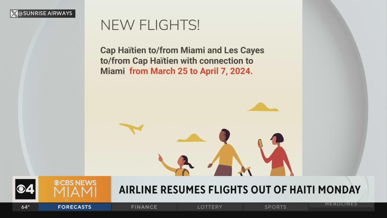 Sunrise Airways -- the Haiti-based airline -- has announced it will resume flights between Cap Haitien, Miami and Les Cayes as the crisis in the Caribbean nation continues.