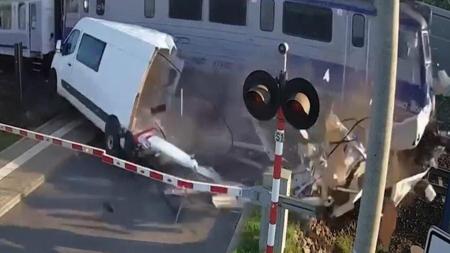 Surveillance video shows moment train slams into van stuck on tracks in Poland