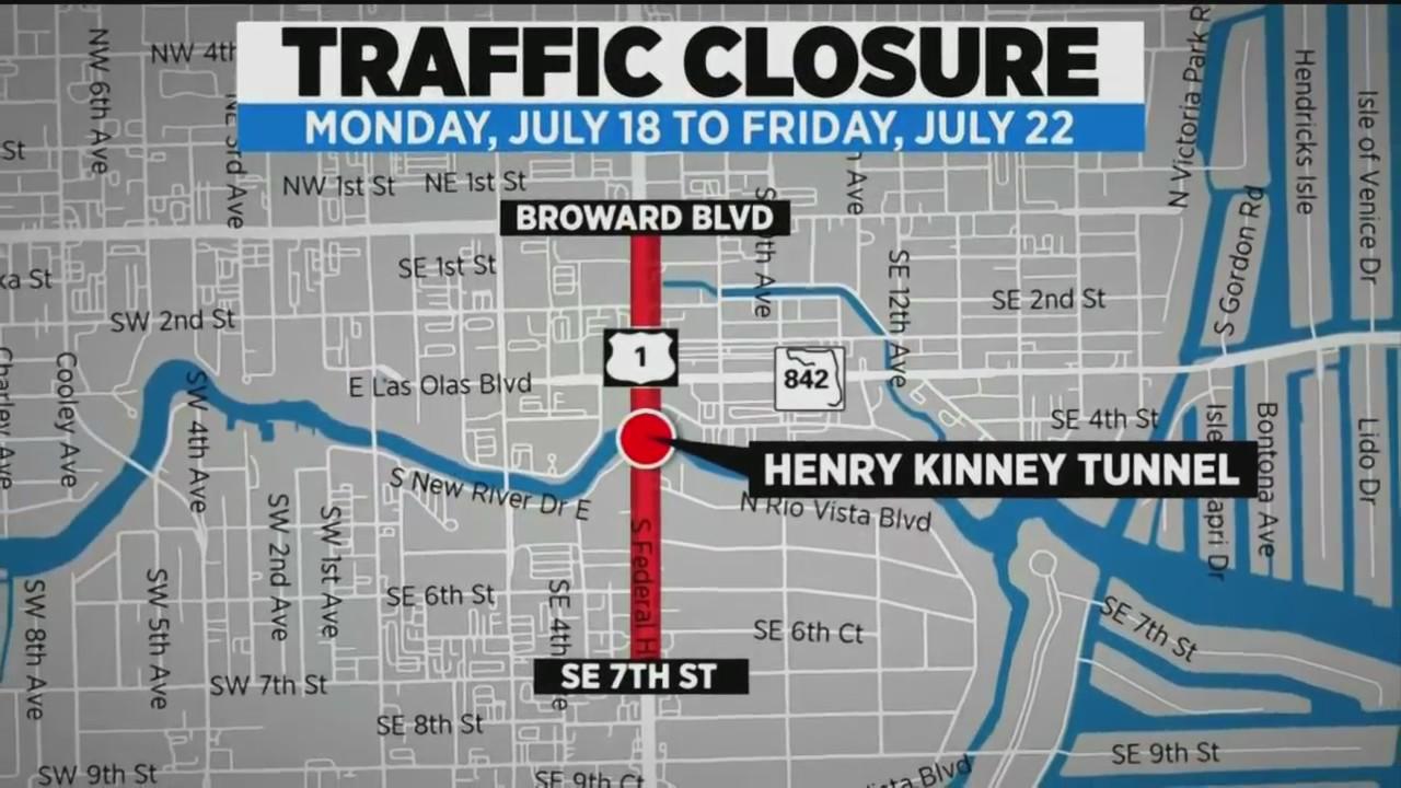 Federal Highway (US-1) and the Kinney Tunnel will be closed from SE 7th Street to Broward Boulevard from Monday, July 18 to Friday, July 22.