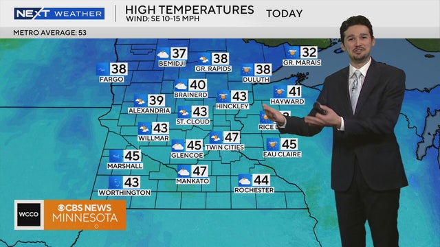 High temperatures will be in the 40s across central and southern Minnesota on Tuesday with wind gusts between 10 mph and 15 mph, according to NEXT Weather meteorologist Chris Shaffer.
