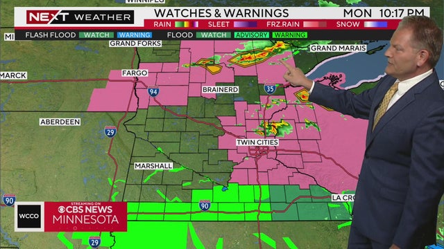 WCCO meteorologist Chris Shaffer says storms are expected in the parts of the Twin Cities and western Wisconsin late Monday night into early Tuesday morning.