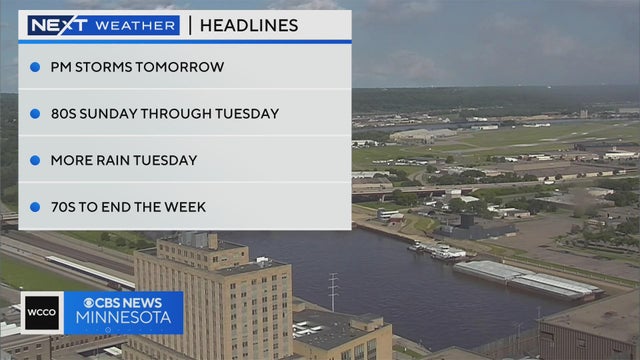 WCCO-TV meteorologist Lisa Meadows says that Saturday night overnight temps are slightly above average. We will see lows in the upper 50s. Storms roll in Sunday evening. There is a chance for severe weather, hitting a 1 out of 5 on the severe weather scale. Rain will stay through Monday.
