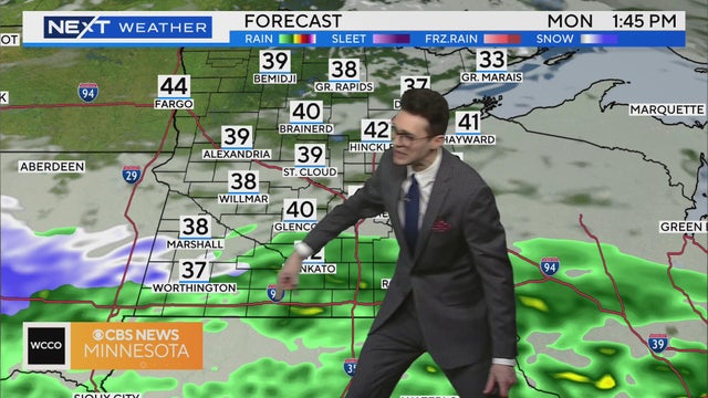 Expect temperatures in the mid-40s on Monday, with showers in southern Minnesota.