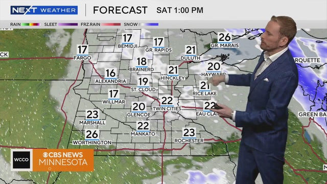 NEXT Weather meteorologist Chris Shaffer said there will be patchy snow showers on Saturday, with high temperatures in the teens and 20s across Minnesota.