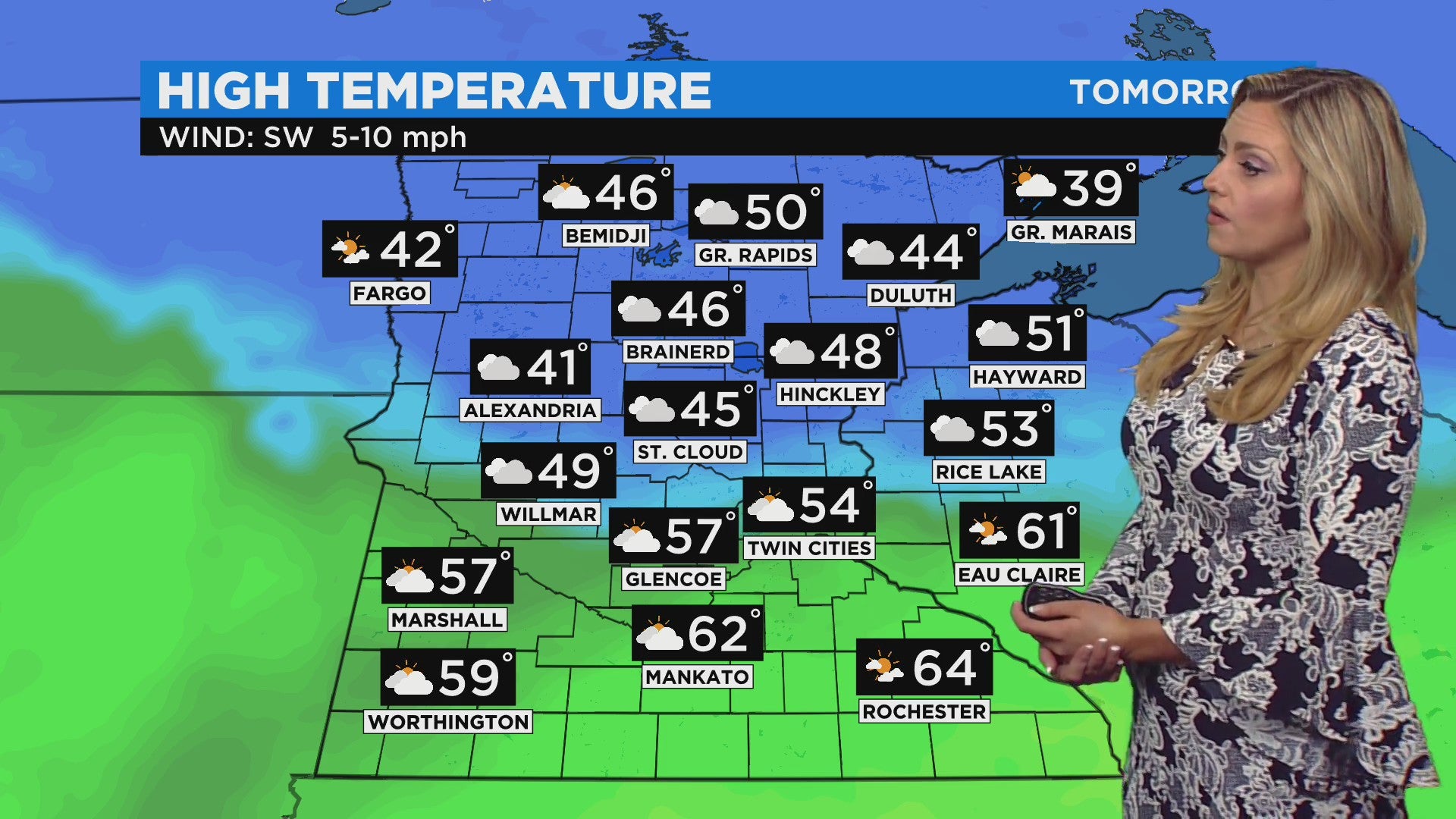 Southern Minnesota will be even warmer, with temps reaching into the high 50s and evens low 60s in communities like Marshall and Worthington. Up north, look for temperatures in the mid- to high 40s.
