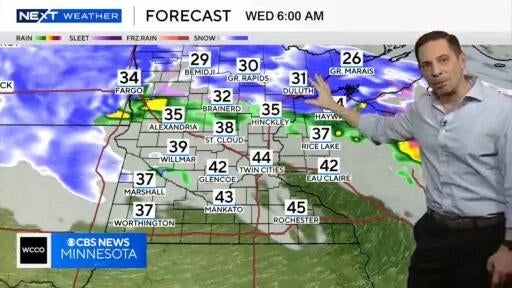 WCCO meteorologist Chris Shaffer says rain could transition into light snow, while heavier snow falls up north.