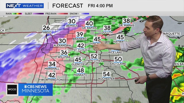Friday will feature rounds of rain with a few rumbles of thunder possible, mainly south, in the afternoon, WCCO meteorologist Mike Augustyniak reports.
