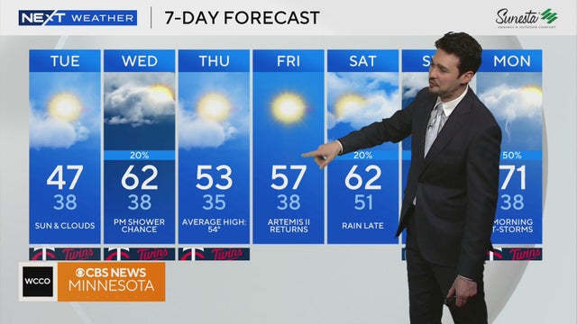 NEXT Weather meteorologist Chris Shaffer says temperatures will be in the 40s on Tuesday in the Twin Cities before warming to the 60s on Wednesday, though some residents could see rain on the latter of the days.