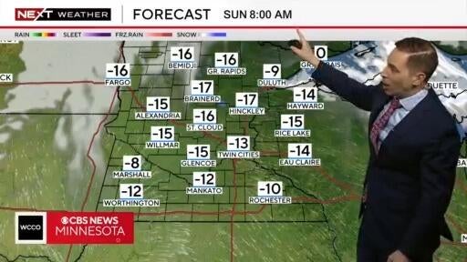 Next Weather meteorologist Mike Augustyniak says temperatures across Minnesota on Sunday morning are expected to drop into the double digits below zero.