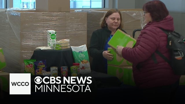 Volunteers are handing out boxes of food at Minneapolis-St. Paul International Airport.