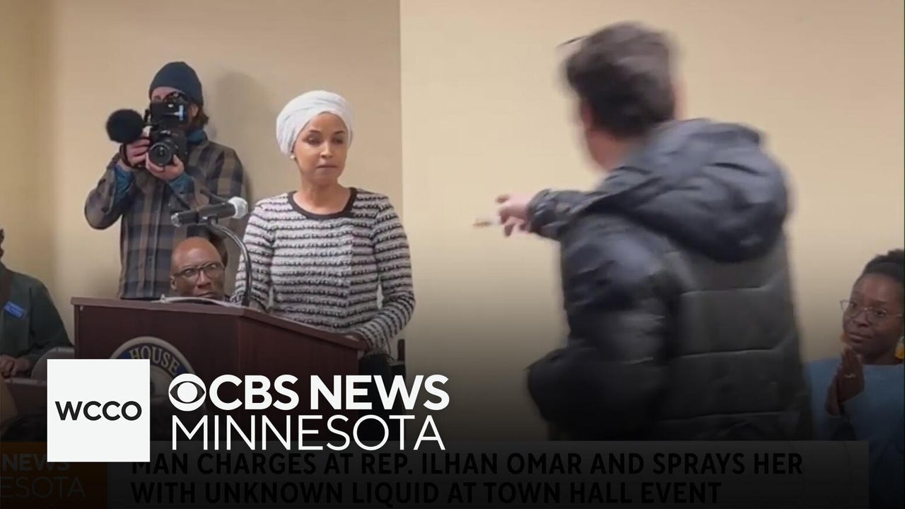 Rep. Ilhan Omar was calling for the abolishment of ICE and for Homeland Security Secretary Kristi Noem to resign when a man sitting in the front row rushed up and sprayed her. He was arrested and Omar was not injured, police said.