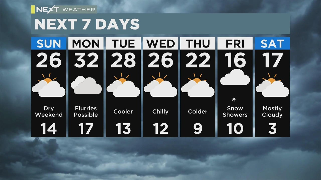 Highs will be in the upper 20s & low 30s heading into the start of the week. Flurries are possible Monday evening.