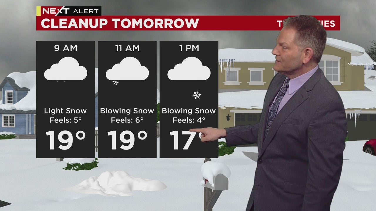 Expect heavy snow and strong winds to continue until lunchtime Thursday.