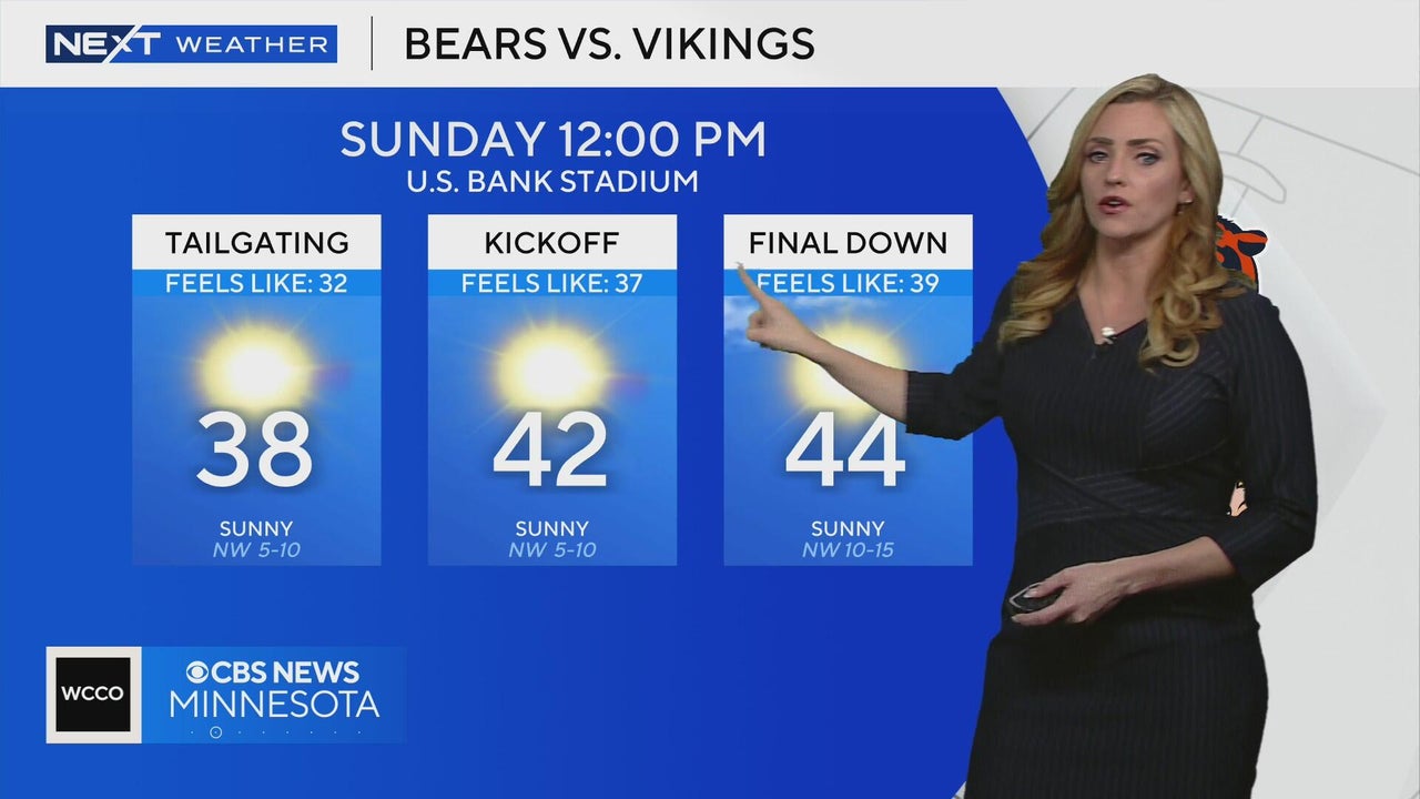 Meteorologist Lisa Meadows says Minnesota Vikings fans tailgating before the Chicago Bears game on Sunday will feel 30-degree temperatures. Temps will rise to the low 40s by kickoff.