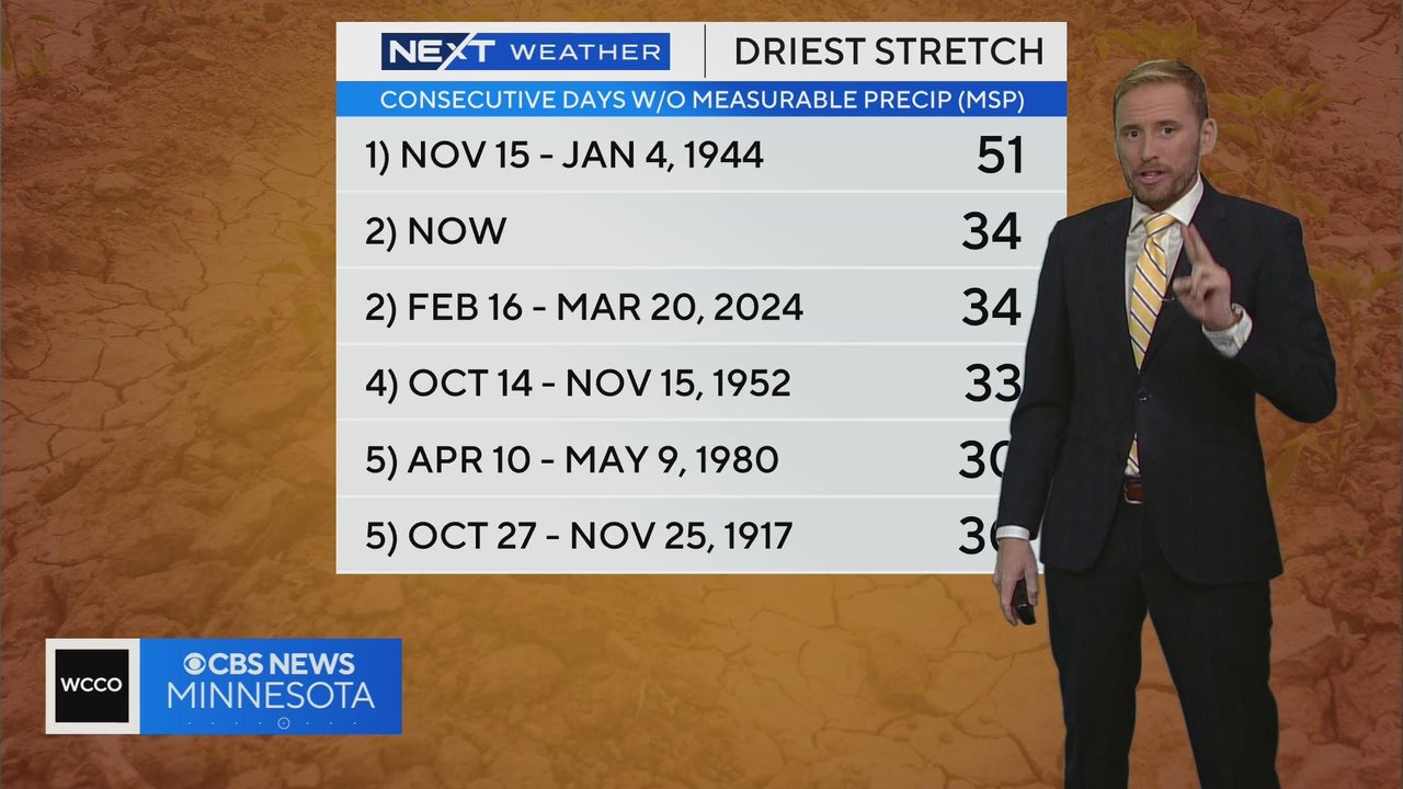 WCCO meteorologist Adam Del Rosso has your latest forecast and he says that this recent stretch without rain has been the driest since February...of this year! However, there is some rain on the horizon.