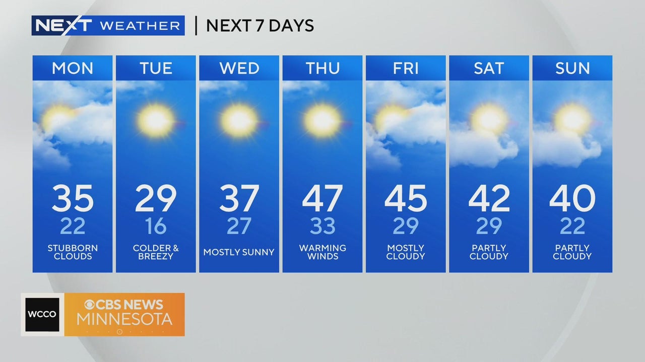 Temperatures will be slightly above average in the Twin Cities Monday, but a weak cold front arriving later will drop highs below freezing on Tuesday.