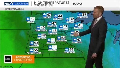 Low pressure tracking across the region on Thursday morning will make for a gloomy day in the Twin Cities, with some clouds and cooler temps.