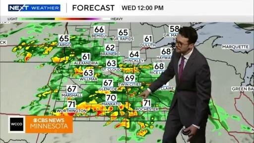 Rain arrives in the Twin Cities mid-morning Wednesday, with waves of thunderstorms likely through Thursday evening, says meteorologist Joseph Dames.
