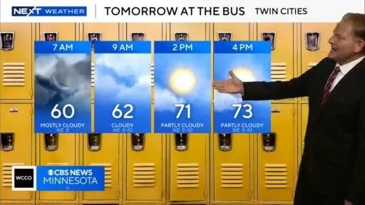 Next Weather meteorologist Chris Shaffer says Tuesday will start out in the low 60s in the Twin Cities, and gradually warm to the low 70s.