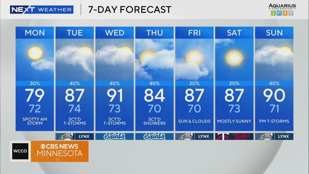 Scattered storms will march across Minnesota Monday, with a heat surge to follow.