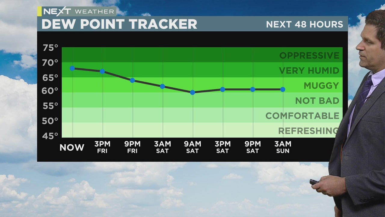 WCCO meteorologist Riley O'Connor says it will be less humid and partly cloudy Saturday, but it gets humid again Sunday as storm chances arrive.