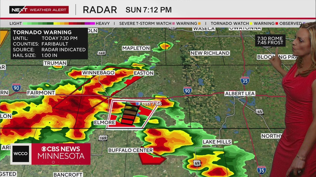 WCCO meteorologist Lisa Meadows is tracking severe storms in southern Minnesota, including a tornado warning for Faribault and Martin counties.
