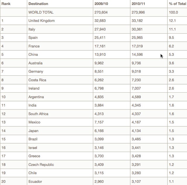Here are the 20 most popular destinations for American students along with the percentage of students each country attracts, as well as the size of the U.S. student population: