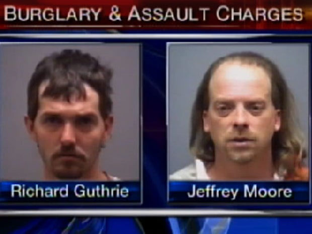 Richard Guthrie, Jr. and Jeffrey Moore were treated at the hospital and released, then jailed. Both are charged with first degree burglary, assault on a female and injury to personal property. Bond for each was set at $15,000.