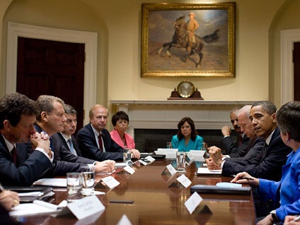 For the first time the Obama and BP teams faced off across a large conference room table in the Roosevelt Room. Both teams looked somber in the official White House photo.