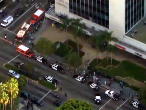 LAPD Sgt. Dino Caldera said the suspect allegedly walked into a high-rise building housing Venture Commercial Realty and shot his co-worker in his office. The victim was taken to a hospital in critical condition.