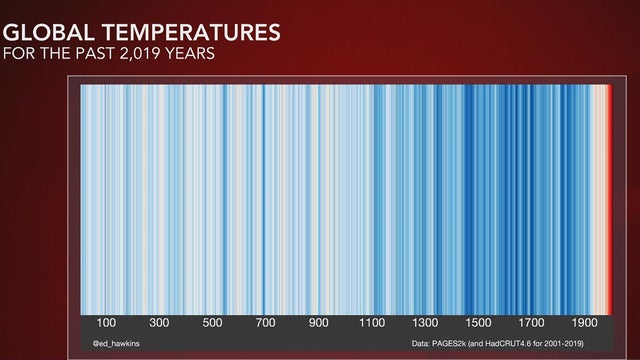 Hawkins is referring to imposter Warming Stripes images posted weeks ago on Twitter, which appear to show that recent warming is not exceptional and just part of a natural cycle. The alternative — and misleading — graphics mimic Hawkins' design, but show a wide zone of red stripes through many earlier centuries of human history.