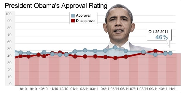 President Obama's approval rating remains consistently below the 50 percent mark, with 46 percent of Americans approving of his job performance and 46 percent disapproving. That's a slight uptick from his rating in September of 2011, when he earned 44 percent support.